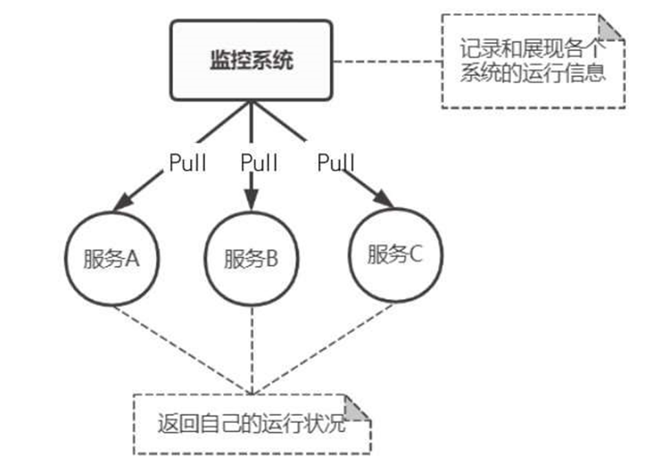 监控系统拉模式架构如图3-37所示,与推模式正好相反,由各服务节点提供接口,由监控系统采用定时异步的方式主动调用各系统的监控接口,获取各节点的运行状况,与Spring Boot Admin和Spring Boot
