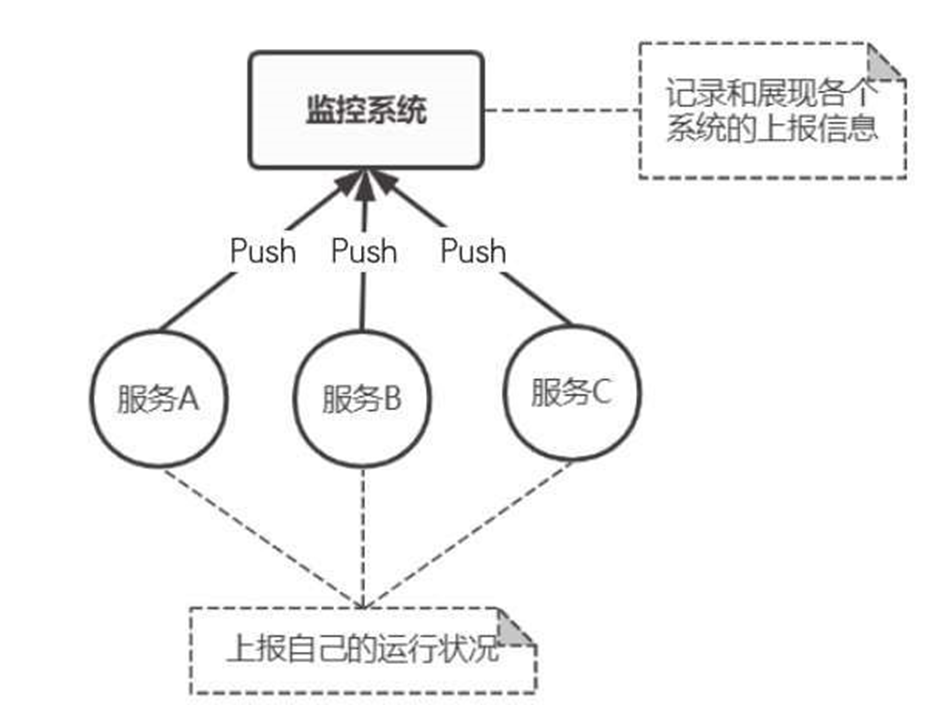 监控系统推模式架构如图3-36所示,由监控系统提供服务接口,各个系统采用定时异步的方式向监控系统主动上报自己的运行状况,包括自己的磁盘、内存、CPU、I/O、GC、线程等各方面情况。监控系统收到之后会进行记录、整理、分析,最后以图表、仪表盘等形式展现出来。
