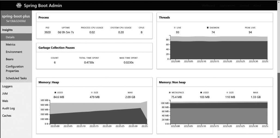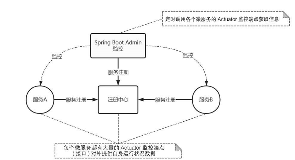 通过注册中心可以感知到整个微服务的所有节点,只要每个微服务都提供相应的监控接口即可。例如,Spring Boot Actuator提供了大量的监控端点(接口),可以针对内存、CPU、环境变量、GC、线程等进行全方位的监控。