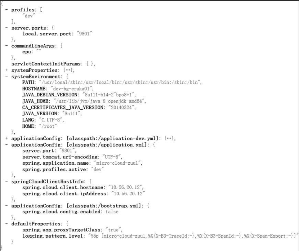 在Spring Boot 1.x项目下访问/env接口,在Spring Boot 2.x项目下访问/actuator/env接口,就可以查询项目的各种环境信息,包括系统环境变量、项目配置文件、默认参数、系统属性、系统端口配置等内容,如图3-33所示。