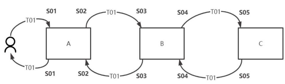 将表3-2中的数据标记到链路图中,如图3-40所示,T01作为TraceID会在整个交易链路中被逐级传递下去,因此使用T01就可以查询到整个交易链路,在什么时间经过了哪些节点。