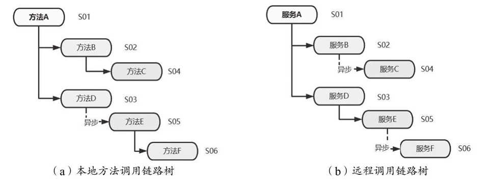 每个方法、每个服务的调用过程都可以构建成一棵调用链路树,每个方法或服务都是树上的一个节点,如图3-42所示,都可以分配一个