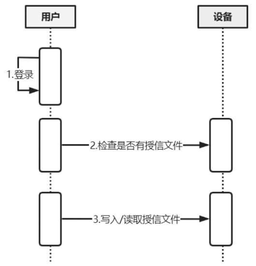 ②         登录成功后,检查本地是否有特定的授信文件。授信文件以加密方式存储,文件中包含被授权的用户信息、设备信息、授信方式。