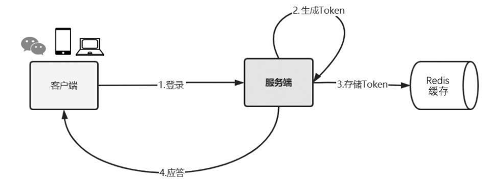 当使用Token模式替代传统Session时,过程如图4-24所示。客户端发起登录请求,服务端验证通过后,生成全局唯一的Token,绑定用户信息,并将Token作为Key存入Redis中。Token模式详细设计可参见5.8 节。