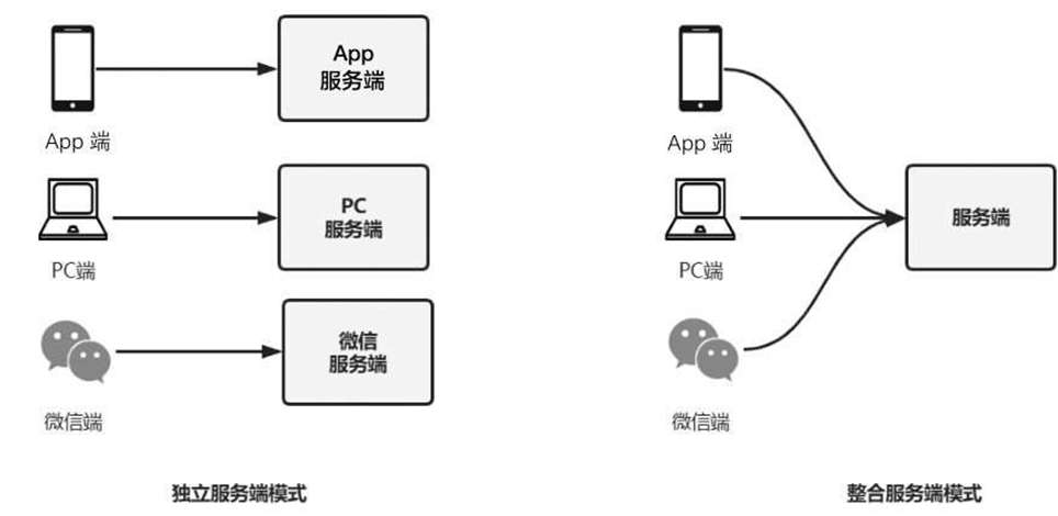(2)     整合服务端模式:所有服务端聚合在一起,同时支持多端应用,优点是复用性强,降低开发量,缺点是各端个性化需求可能相互影响,增加实现的复杂度。