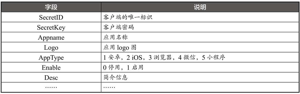 而应用信息配置设计,是一种扩展性更强的方案,思想来源于多租户的开放平台设计理念,将每个客户端进行定义,为其分配唯一标识符。将此标识符放在所有的请求信息头上携带,以供服务端进行判断,同时还可以起到安全控制的作用。应用信息配置部分字段如表4-3 所示。