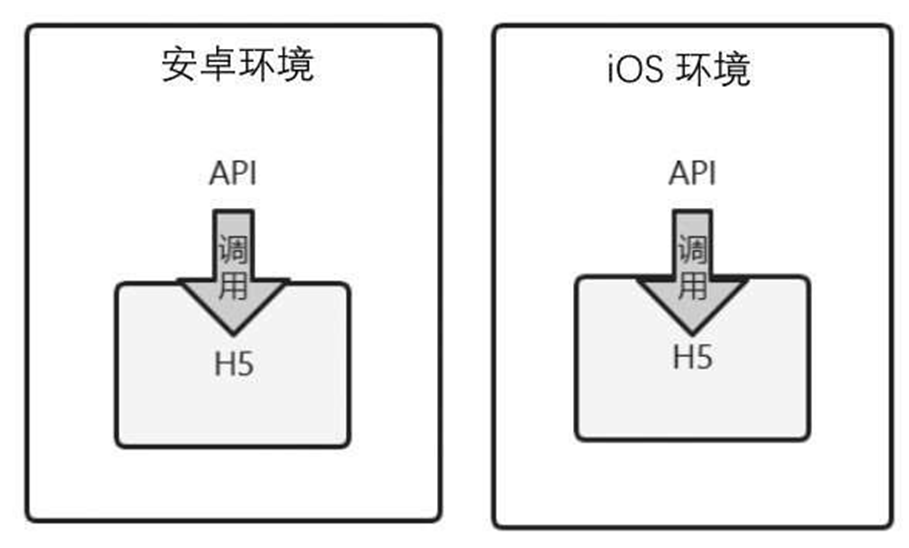 如图4-21所示,安卓端、iOS端都要为H5提供统一的API进行信息封装,获取当前所处的环境信息,如操作系统、版本、机型、品牌等信息,对于用户的登录信息、业务信息也可以通过这种方式来进行传递。H5通过判断所处的环境信息不同,而进行不同的页面展示。