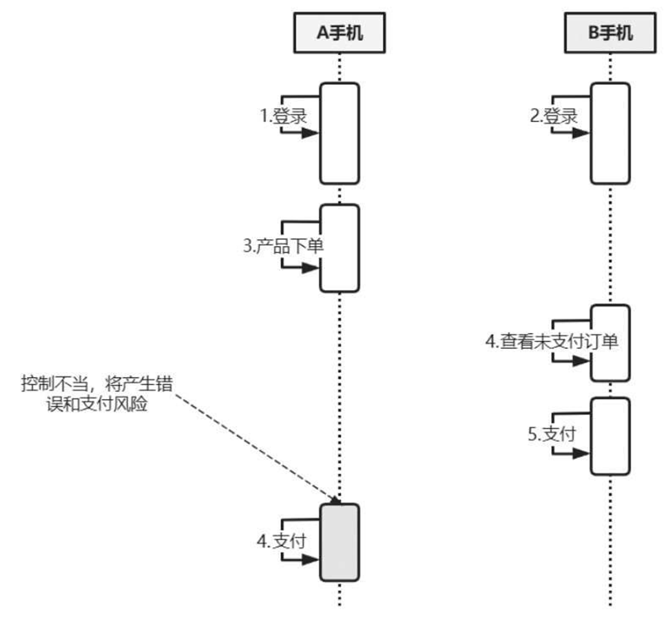 如图4-25所示,模拟电商类App,使用相同账号在两个手机上进行登录购买的流程。使用A手机购买某商品,但是并未支付,还停留在支付页面。 使用B手机找到这笔未支付的订单进行支付,支付成功。这时回到A手机上再点击“支付”按钮,如果服务端控制不当,就会造成数据异常,甚至造成用户重复支付。