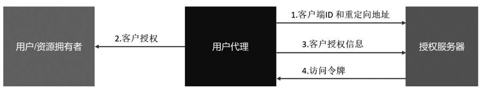 简化模式只是授权码模式的一种简化。在授权码模式中,需要先获取授权码,再使用授权码去获得访问令牌。而简化模式省略了这个步骤,在用户授权后就直接将访问令牌返回给客户端,其余流程完全一致。简化模式交互流程如图4-47所示。