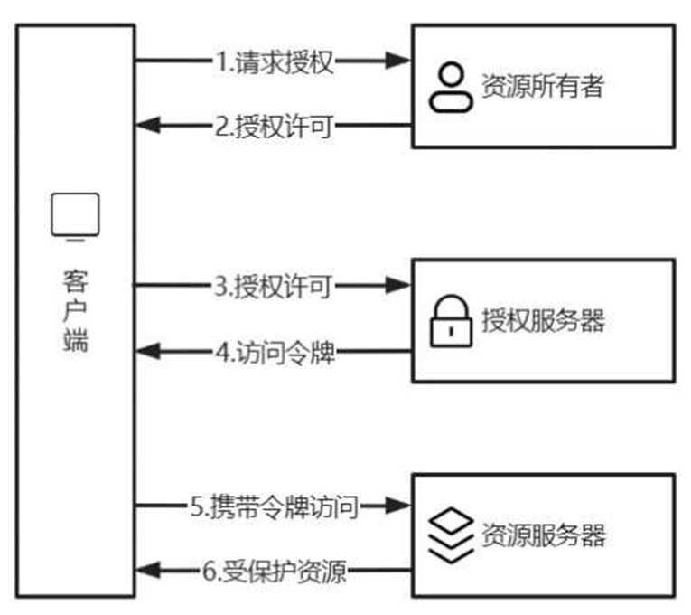 (1)客户端请求资源所有者的授权。(2)资源所有者同意授权,返回授权许可(Authorization