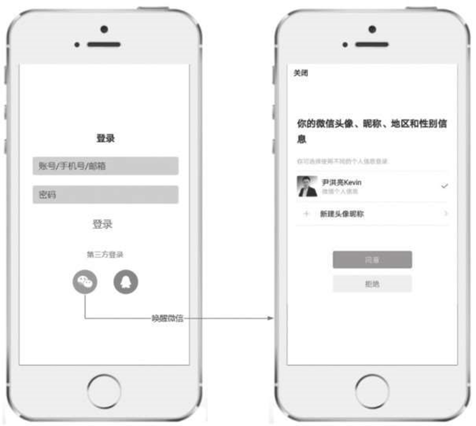如图4-43所示,在App端可以选择微信登录,点击“微信”图标会唤醒手机中的微信App,询问用户是否同意授权,用户点击“同意”按钮就代表授权通过,则用户的头像、性别、用户ID等信息就会授权给第三方使用,对于在Web端的微信扫码登录,原理也是相同的。