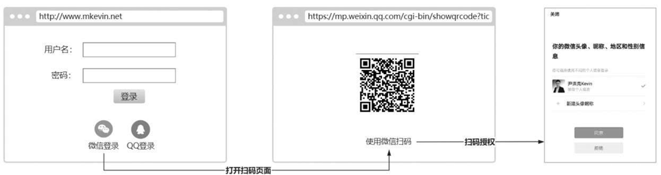 一般的第三方账号登录,如QQ登录、微信登录、微博登录等都采用授权码模式实现,此种模式流程最为复杂,安全性也最高。下面以某网站使用微信扫码登录为例,详细讲解授权码模式的原理,如图4-45 所示。