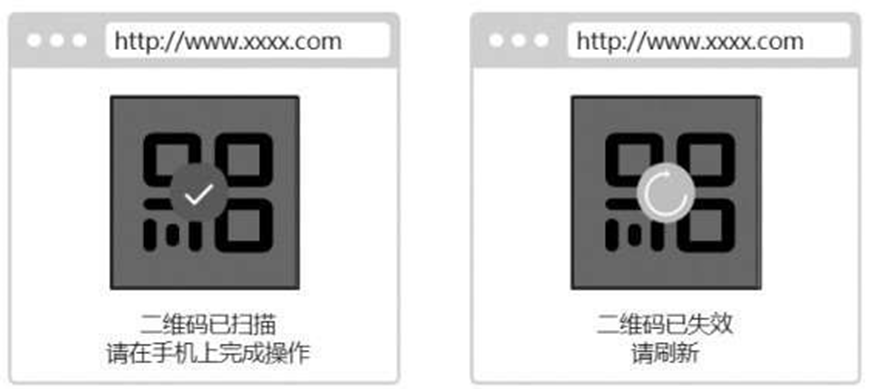 (6)     第1.6~1.8步:浏览器页面再使用qcode不断地去轮询二维码服务,查询当前二维码的状态是什么。如果状态为已扫描,则页面显示二维码已扫描;如果状态为已失效,则页面提示二维码已失效,如图4-52所示。