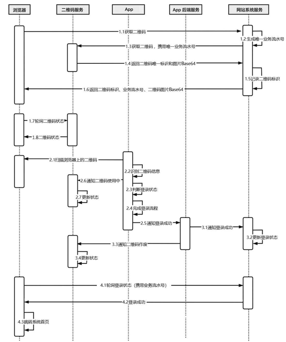扫码登录是由多个系统协作完成的,包括浏览器、二维码服务、App、App后端服务和网站系统服务。扫码登录实现流程如图4-51所示。