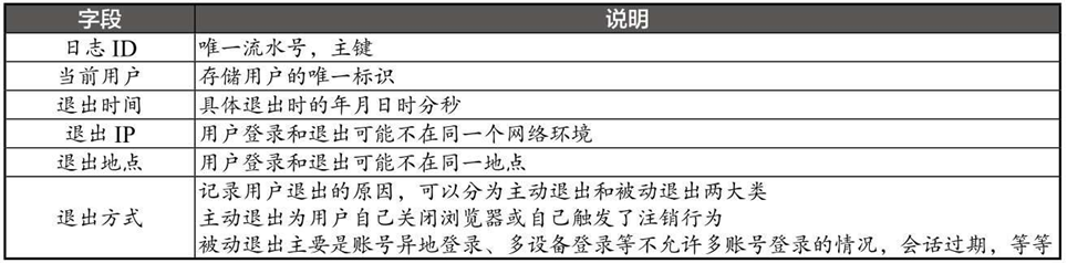 用户的退出行为,很多时候并不需要完整的记录,用户可能直接关闭了浏览器,或者由于Session到期导致被动退出,这种情况下往往是不记录日志的。甚至有些系统设计是不保存用户退出日志的,如用户保持了登录状态,只要客户端还留存有相应的Cookie或登录令牌,则始终保持登录状态。