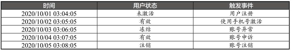任何数据的变化都是由某个事件的触发而改变的。例如,对于某个用户状态的变化可以记录为表6-8所示的数据。