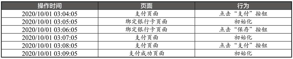 用户的操作过程。例如,一次支付过程可以记录为表6-6所示的数据。