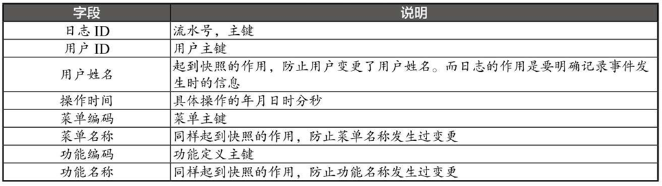 如表6-5所示,如果想要记录每个功能的操作日志,则必须要先将功能定义出来(包含功能编码、功能名称、功能描述等),这一般是在权限设计时就确定的,可参见5.7节。
