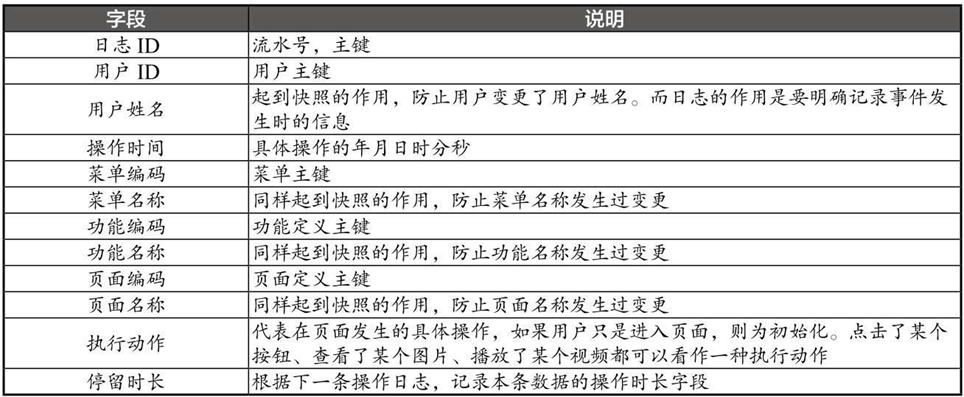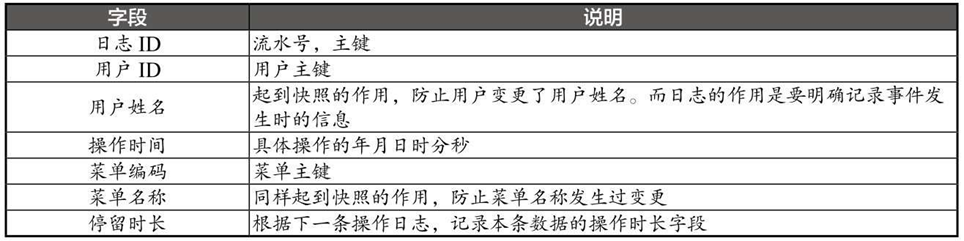 菜单操作日志就是记录用户对于系统菜单(包括PC端系统、移动端系统)的使用轨迹,以便于进行指标分析和问题查证。要记录的内容包括当前用户在什么时候、进入了哪个菜单,停留了多长时间。菜单日志记录表的结构如表6-4所示。