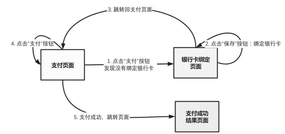 如表6-6所示,记录了用户一次完整的支付操作流程,可以将日志转化为流程图展示,如图6-7所示。用户首先进入支付页面,点击“支付”按钮,发现没有绑定银行卡,所以跳转到银行卡绑定页面,在页面中点击“保存”按钮,完成了银行卡绑定,又跳转到支付页面,在支付页面点击“支付”按钮,最后支付成功并跳转到支付成功页面。这样就可以很轻松地重现用户操作,排查系统问题了。