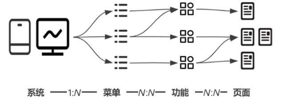 系统、菜单、功能和页面的关系如图6-6所示。一个系统中包含多个菜单,每个菜单中包含多个功能,每个功能又包含多个页面。同时,一个页面可以被多个功能共用,一个功能也可以放入多个菜单中。在这样复杂的关系下,可以将操作日志分为菜单操作日志、功能操作日志、流程操作日志和业务操作日志。对于不同的操作日志,也要采用不同的设计方式。