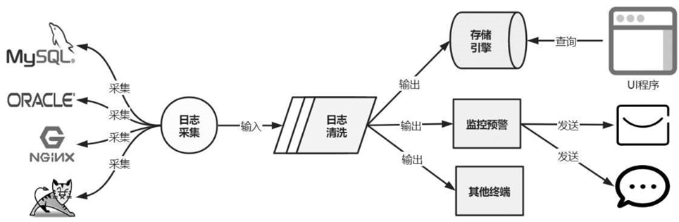 (1)     日志采集:可以从不同的数据源采集日志,可以是应用程序、数据库、中间件、网络、操作系统等。