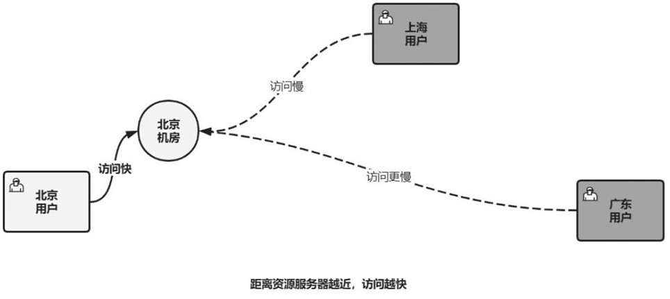 如图2-81所示,北京、上海、广东的用户都访问相同的资源文件(如某个页面、音频、视频)。服务器部署在北京机房,因此距离北京的用户最近,网络传输最短,网络冲突损耗最低,所以访问速度也最快,而上海、广东的用户访问就会很慢。