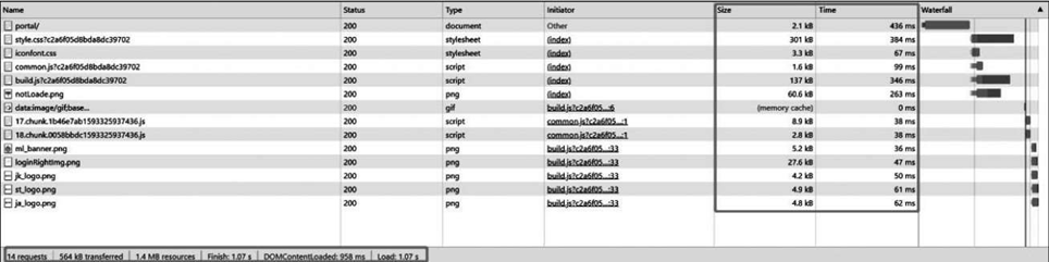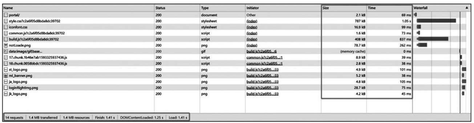 如图2-85所示,加载某系统页面,需要加载14项资源,总计1.4MB 的传输,在没有开启Nginx缓存设置,也没有开启gzip压缩的情况下,页面加载总计耗时1.41秒。