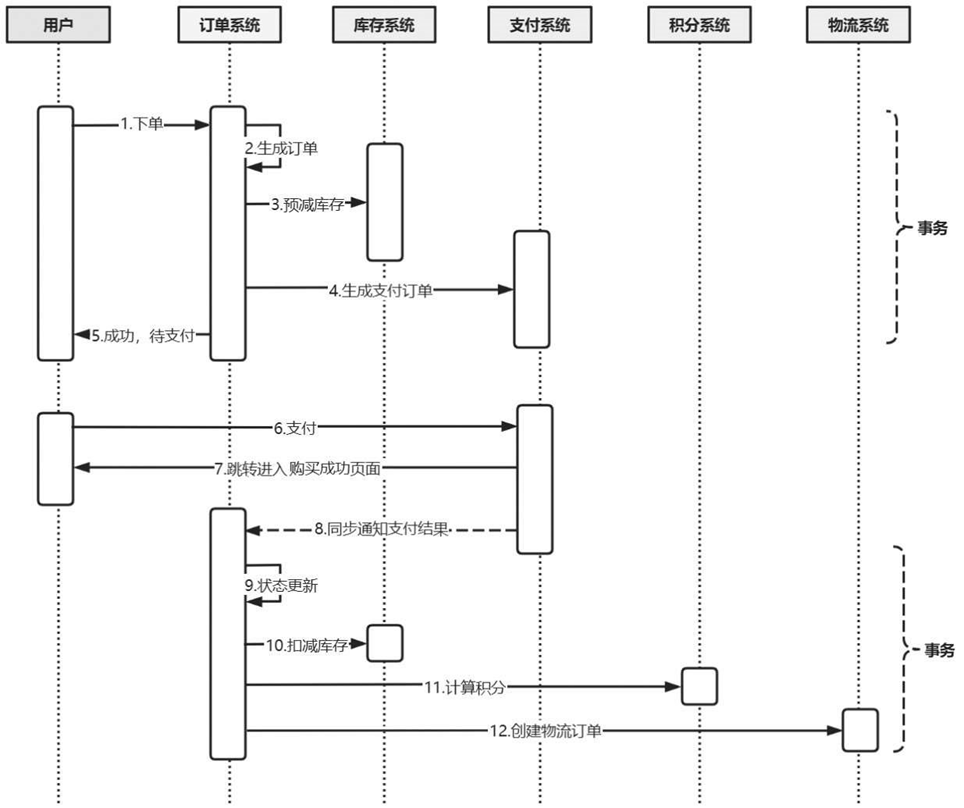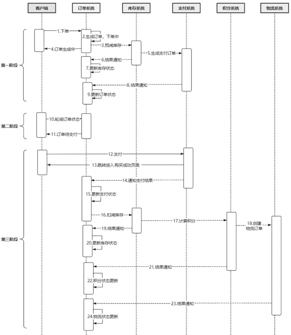 在同步调用的设计中,这些步骤必须按照严格的顺序执行,1~5步是一个事务,8~12步也是一个事务。它们的共同点是流程长,事务较大。在这个过程中会产生数据库锁,从而导致数据库资源被长时间占用,锁竞争加剧,从而导致吞吐量下降,在高并发场景下,情况会进一步恶化,用户需要更长的时间等待。