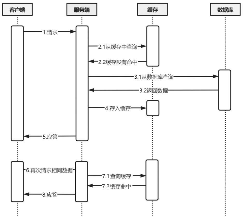 (2) 第6~8步:当用户再次请求相同数据时,服务端可以直接在缓存中找到匹配的数据(缓存命中),然后返回给客户端,这样就避免了数据库查询操作。