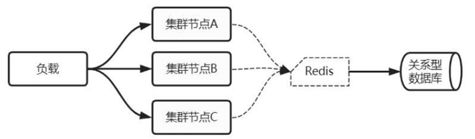 在集群架构下,客户端的请求经由负载设备被分发到不同的集群节点,所有的节点使用同一个Redis缓存服务,如图2-93所示。