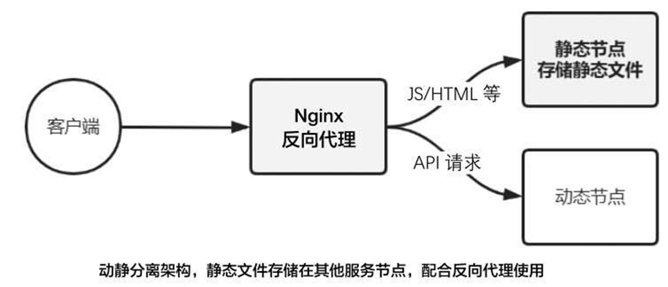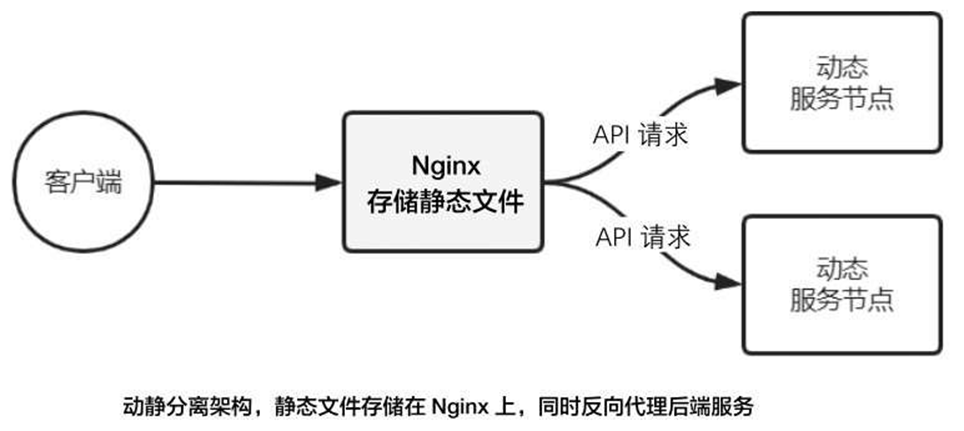 将静态文件存储在Nginx上,使用Nginx作为静态服务器,以此来实现动静分离架构模式。上游服务器提供给动态接口(动态服务节