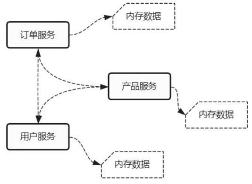 在分布式架构下,每个节点也都有自己的内存缓存,缓存的内容各不相同,只缓存与系统本身相关的内容。如图2-92所示,订单服务缓存订单配置信息,用户服务缓存用户配置信息,产品服务缓存产品配置信息,各个服务的缓存也同样无法共用。