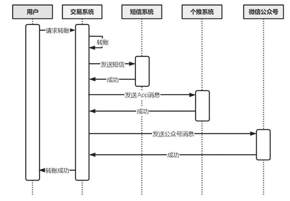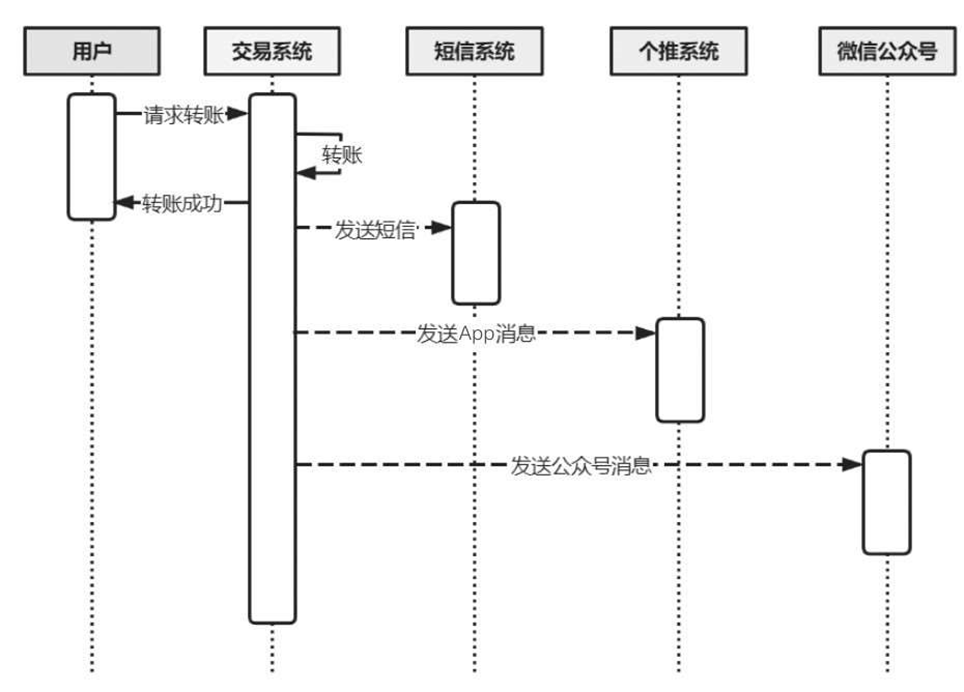 发送短信、发送App消息、发送公众号消息都属于非核心业务,是否发送成功、是否及时其实不是至关重要的,对于转账成功与否没有任何影响。