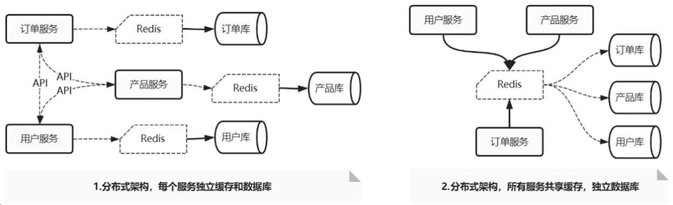 在分布式架构下,每个服务都可以使用自己独立的缓存服务,也可以共享缓存服务。至于选择哪种模式,还要根据具体的业务和数据量进行分析。两种模式的架构方式如图2-94所示。如果是小型分布式系统,需要缓存的数据量不大,并且对于缓存的隔离性没有要求,则可以采用共享模式。