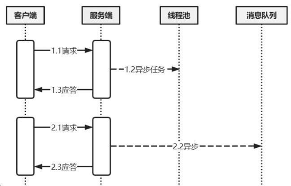 异步方式可以承载大量的并发请求,服务端接收请求后,交由异步线程处理,或者直接丢入消息队列中,然后立即给客户端应答,具有响应速度快、吞吐量高的特点。异步化流程如图2-95所示。